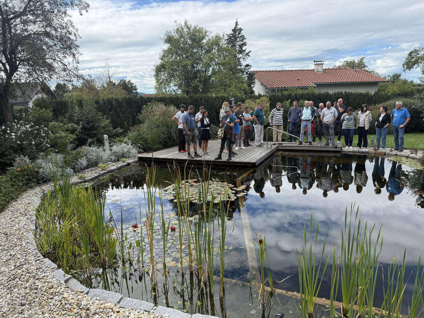 První dva dny patřily exkurzím. Objeli jsme přibližně patnáct realizací v okolí Vídně – od velmi přírodních jezírek s bohatou vegetací až po čistě technické biobazény s různými variantami filtračních systémů. Viděli jsme privátní zahrady, ukázkové projekty i firemní showroomy.